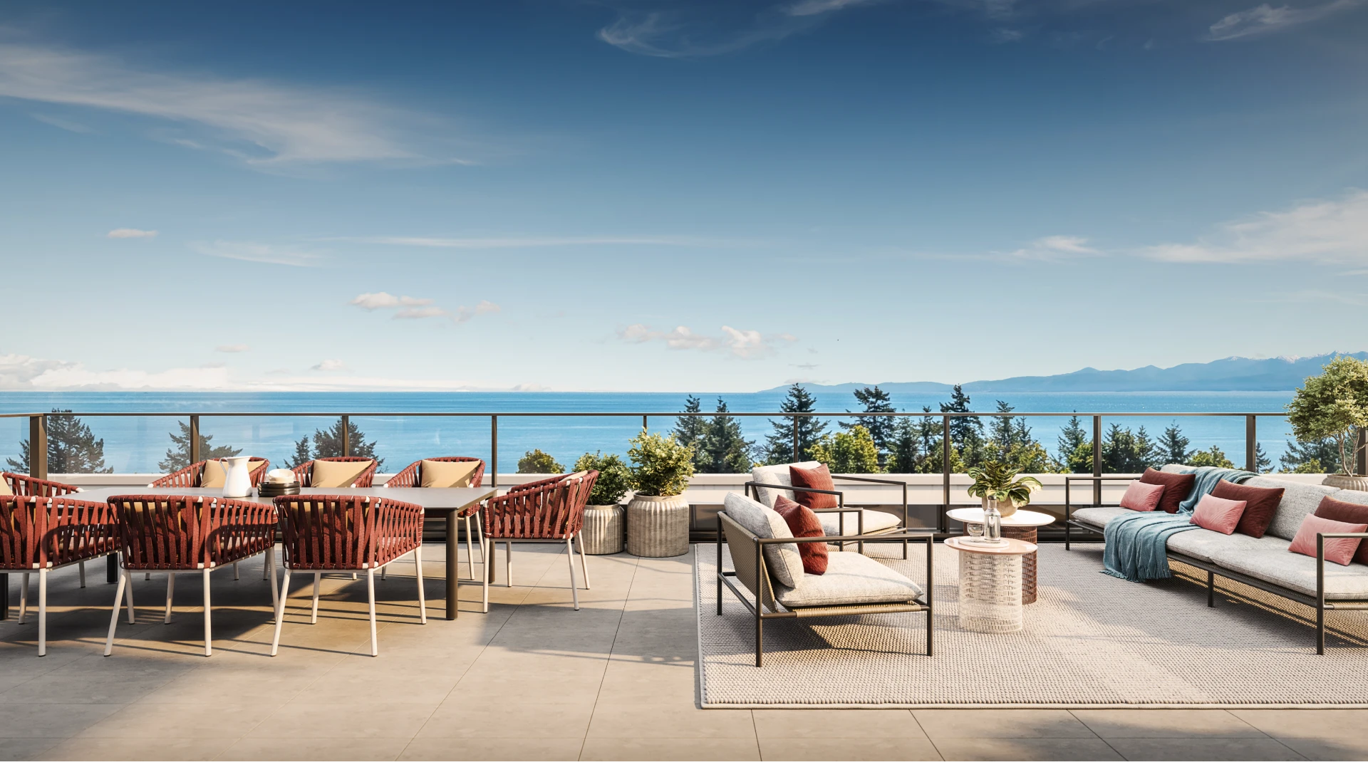 SOAKING IN PANORAMIC OCEAN VIEWS from the expansive rooftop lounge is an everyday activity at Origin. With a fully equipped outdoor kitchen with BBQ, a variety of seating and gathering areas, and a large harvest dining table, this dawn-to- dusk gathering place is an unmatched amenity, and the perfect setting for a gathering or a getaway.